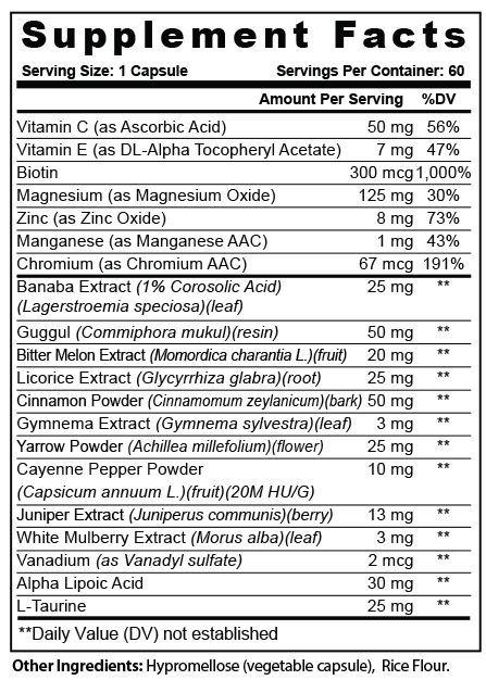 Active ingredients: Vitamin C (as ascorbic acid); Vitamin E (as DL-alpha tocopheryl acetate); Biotin; Magnesium (as magnesium oxide); Zinc (as zinc oxide); Manganese (as manganese AAC); Chromium (as chromium AAC); Banaba Extract (Lagerstroemia speciosa) leaf; Guggul (Commiphora mukul) resin; Bitter Melon Extract (Momordica charantia L.) fruit; Licorice Extract (Glycyrrhiza glabra) root; Cinnamon Powder (Cinnamomum zeylanicum) bark; Gymnema Extract (Gymnema sylvestra) leaf; Yarrow Powder (Achillea millefolium) flower; Cayenne Pepper Powder (Capsicum annuum L.) fruit; Juniper Extract (Juniperus communis) berry; White Mulberry Extract (Morus alba) leaf; Vanadium (as vanadyl sulfate); Alpha Lipoic Acid; L-Taurine. Other ingredients: Hypromellose (vegetable capsule), Rice Flour.