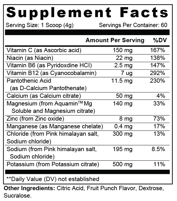 Active ingredients per serving: Vitamin C (as ascorbic acid); Niacin (as niacin); Vitamin B6 (as pyridoxine HCl); Vitamin B12 (as cyanocobalamin); Pantothenic acid (as D-calcium pantothenate); Calcium (as calcium citrate); Magnesium (from Aquamin™ Mg soluble and magnesium citrate); Zinc (from zinc oxide); Manganese (as manganese chelate); Chloride (from pink Himalayan salt, sodium chloride); Sodium (from pink Himalayan salt, sodium chloride); Potassium (from potassium citrate). Other ingredients: Citric Acid; Fruit Punch flavor; Dextrose; Sucralose.